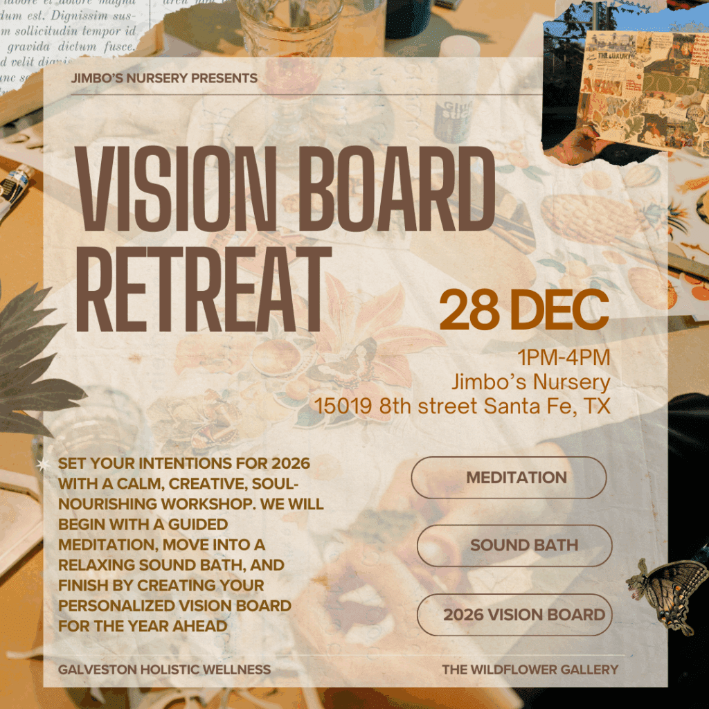 Get ready for the new year with our Vision Board Retreat! Hosted by The Wildflower Gallery & Galveston Holistic Wellness, you will leave feeling refreshed & energized for 2026!