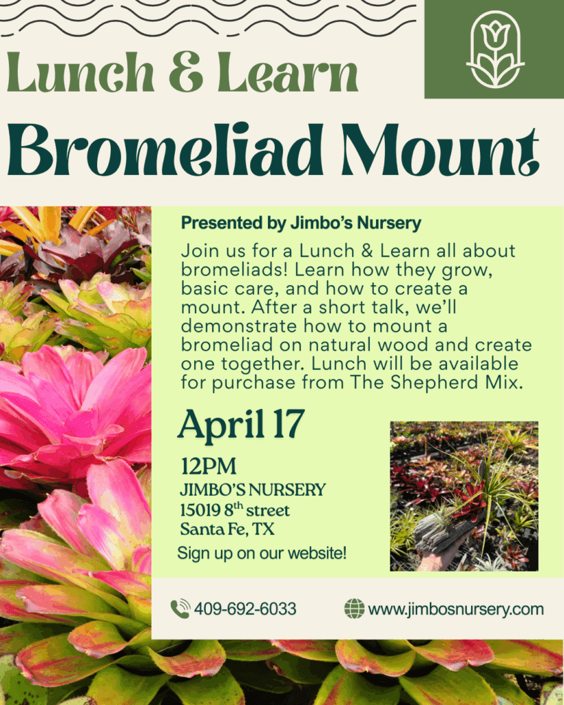 Learn how to create a Bromeliad Mount while you enjoy lunch from The Shepherd Mix!